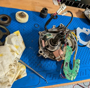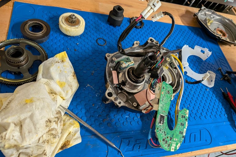 Grâce à la formation faite par l'organisme Ligne de chaîne , j'ai pu acquérir des connaissances supplémentaires. Ma prestation ne s'arrête pas à brancher le vélo à l'ordinateur. L'entretien de l'unité motrice sur la partie mécanique est réalisé avec soin, comprenant des graisses de qualité aéronautique et des roulements sélectionnés pour durer. Sur les câblages j'interviens également pour réparer ou remplacer.